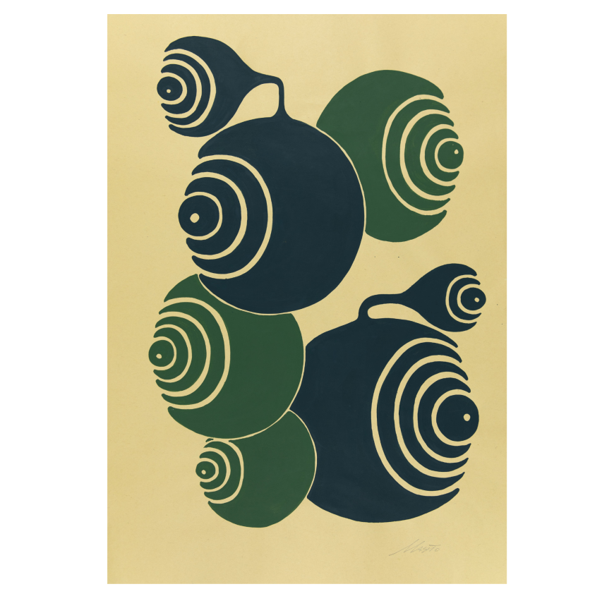 With S7521‑V130, Masito introduces us to a universe populated by fantastic figures and symbolic elements, born from his background as a writer, graphic artist and calligrapher. On a neutral background, sleek silhouettes emerge with a graphic vigour that echoes urban energy and futuristic imagination. The work is inhabited by one of his “Sideralis” creatures: hybrid forms, rounded, carrying anthropomorphic elements and strong graphic impact.